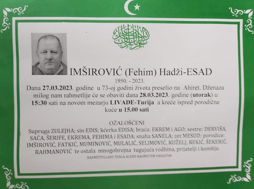 Tužnim srcem javljamo rodbini, prijateljima i poznanicima da je naš dragi Imširović (Fehim) Hadži- Esad dana 27.03.2023. godine u 73-oj godini života na Ahiret preselio.