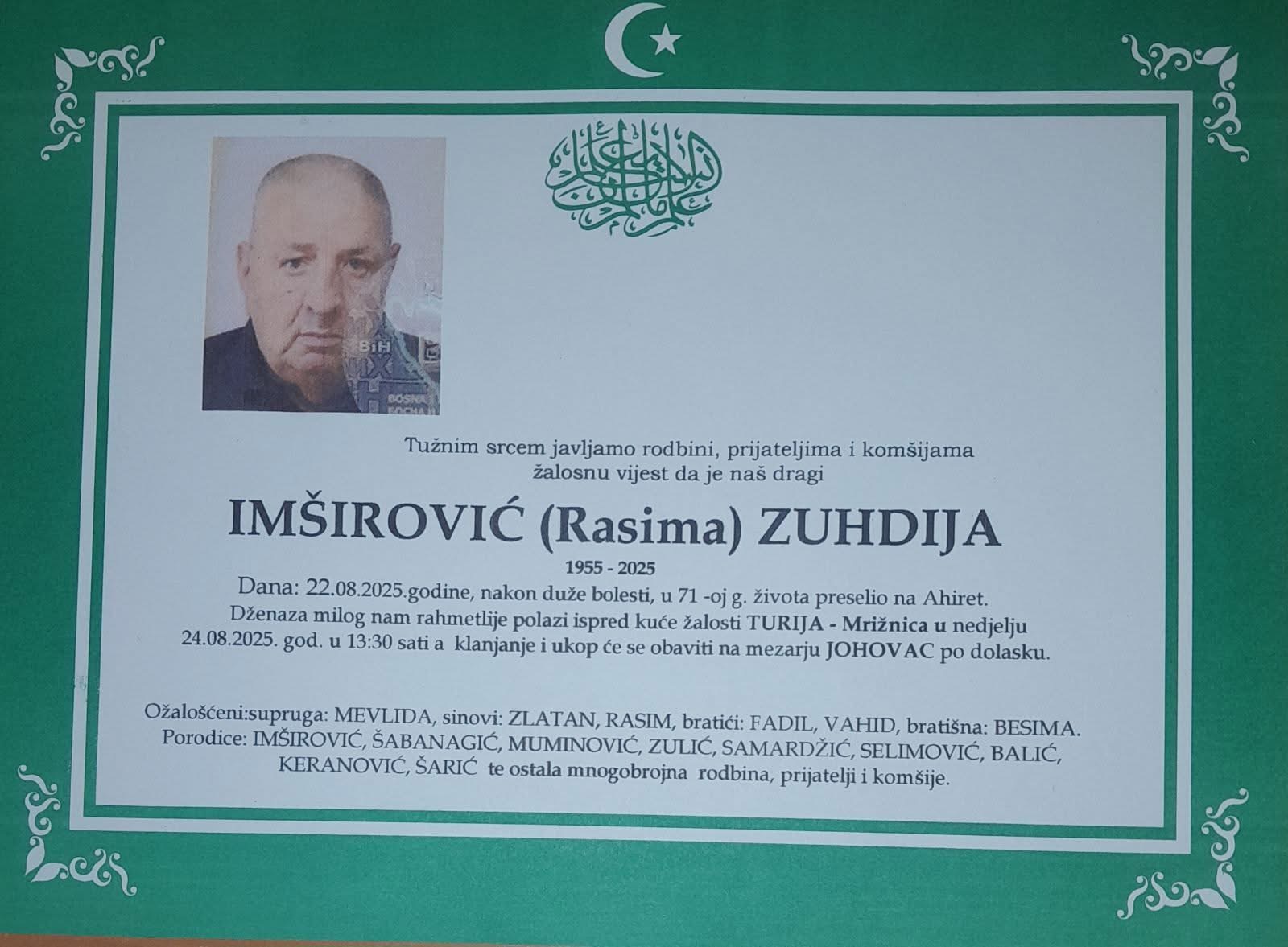 Dženaza milog nam rahmetlije polazi ispred kuće žalosti TURIJA – Mrižnica u nedjelju 24.08.2025. god. u 13:30 sati, a klanjanje i ukop će se obaviti na mezarju JOHOVAC po dolasku.