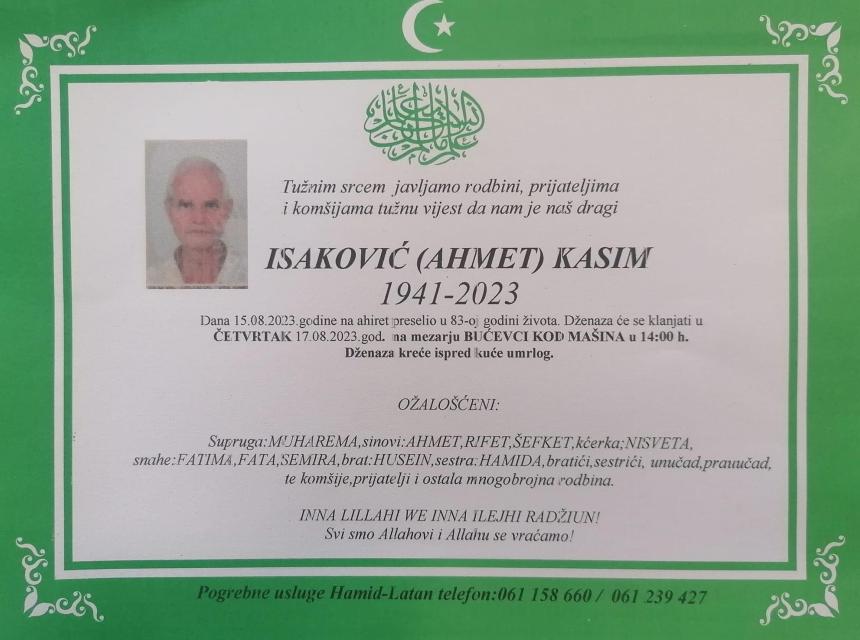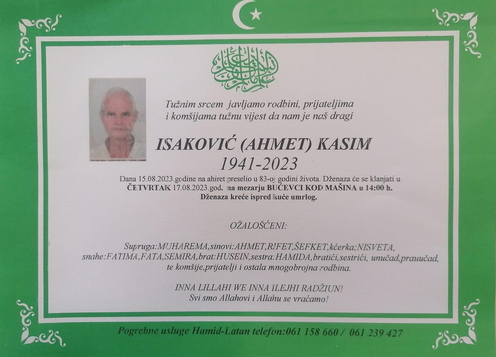 Tužnim srcem i bolom u duši javljamo rodbini, prijateljima i komšijama da je naš dragi Isaković (Ahmet) Kasim preselio na Ahiret dana 15.08.2023 godine, u 83-oj godini života