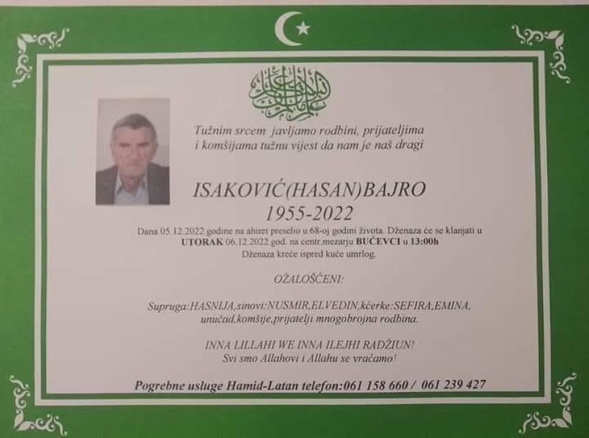 Tužnog srca i s bolom u duši obavještavamo rodbinu, komšije i prijatelje da je naš dragi Isaković (Hasan) Bajro, dana 05. 12. 2022. godine u 68. godini zivota preselio na Ahiret.