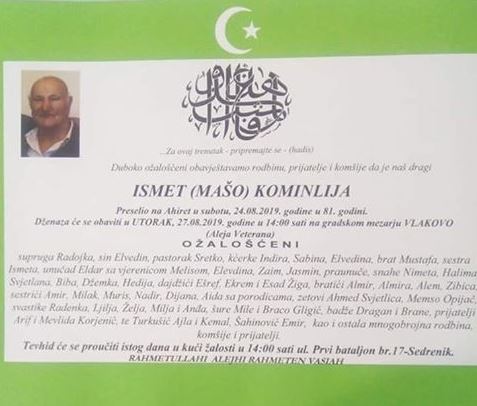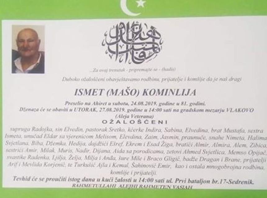 Duboko ožalošćeni obavještavamo rodbinu, prijateljima i komšijama da je naš dragi Ismet (Mašo) Kominlija preselio na Ahiret u subotu, 24.08.2019.godine u 81.godini. Dženaza će se obaviti u utorak, 27.08.2019.godine u 14:00 sati na gradskom mezarju Vlakovo (Aleja Veterana).