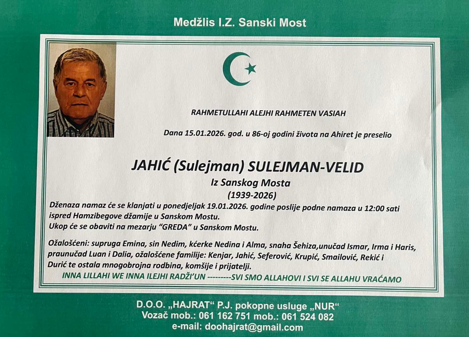 Dženaza-namaz će se klanjati u ponedjeljak 19.01.2026. godine, poslije podne-namaza u 12:00 sati, ispred Hamzibegove džamije u Sanskom Mostu.