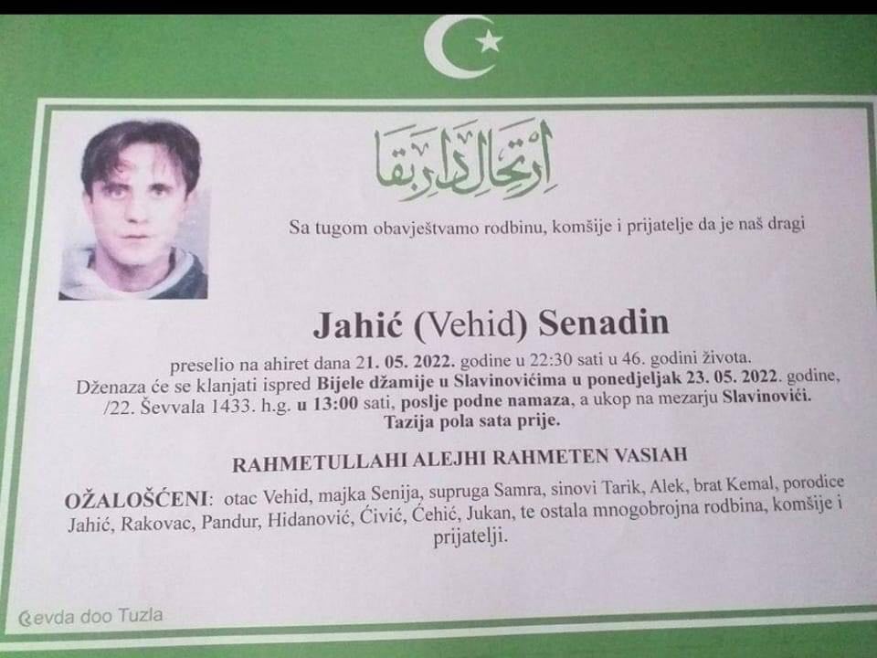 Tužnog srca i s bolom u duši obavještavamo rodbinu, komšije i prijatelje da je naš dragi Jahić (Vehid) Senadin u 46. godini života preselio na Ahiret.