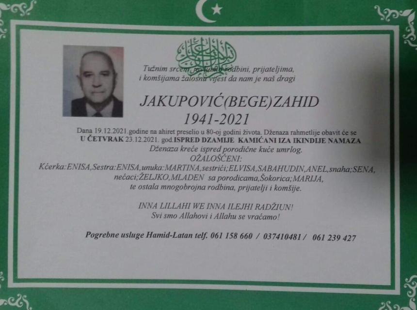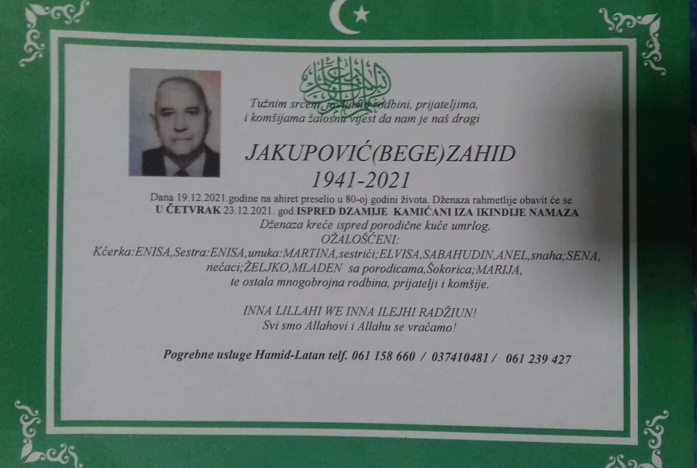 Tužnog srca i s bolom u duši obavještavamo rodbinu, komšije i prijatelje da je naš dragi Jakupović (Bege) Zahid dana 19.12.2021. u 80. godini života preselio na ahiret.