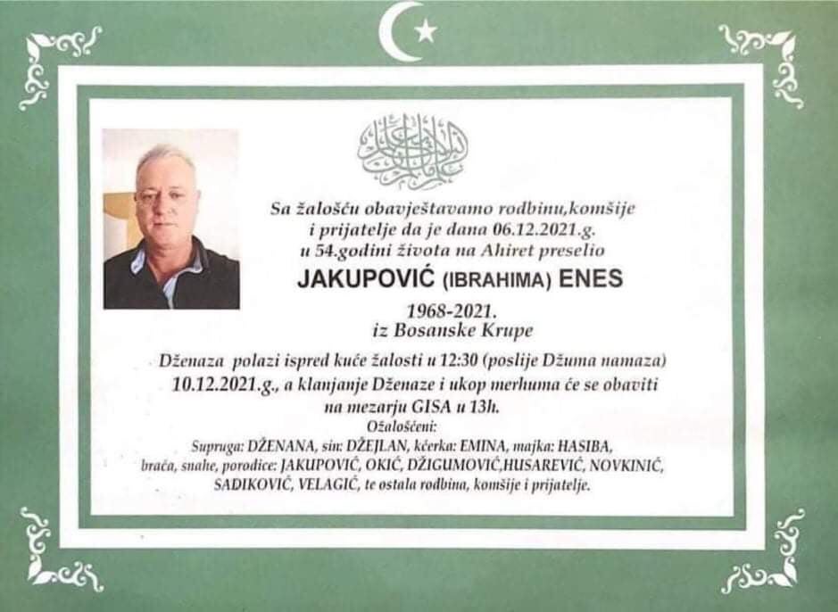 Tužnog srca i s bolom u duši obavještavamo rodbinu, komšije i prijatelje da je naš dragi Jakupović (Ibrahima) Enes, dana 06.12.2021. godine, u 54-oj godini života, preselio na Ahiret.