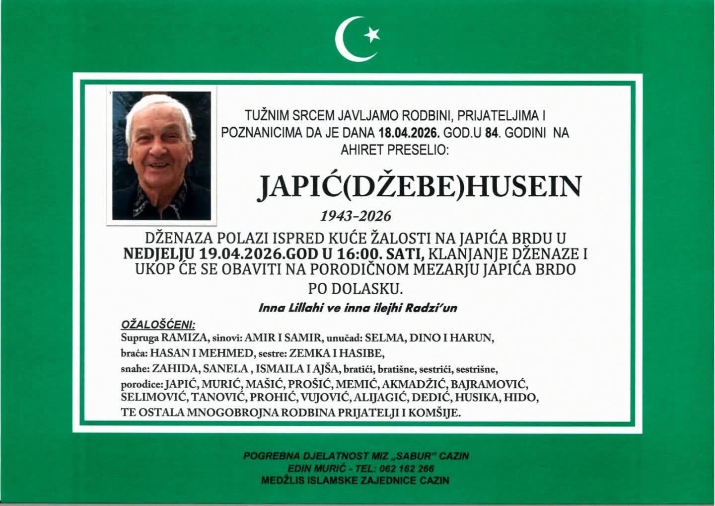 Dženaza polazi ispred kuće žalosti na Japića brdu u nedjelju, 19.04.2026. godine u 16:00 sati. Klanjanje dženaze i ukop će se obaviti na porodičnom mezarju Japića brdo po dolasku.