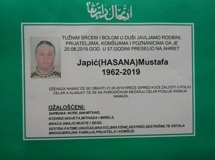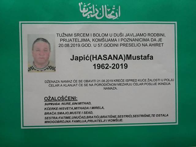 Tužnim srcem i bolom u duši javljamo rodbini, komšiji i poznanicima da je dana 20.08.2019. godine u 57. godini života na Ahiret preselio Japić (Hasana) Mustafa.