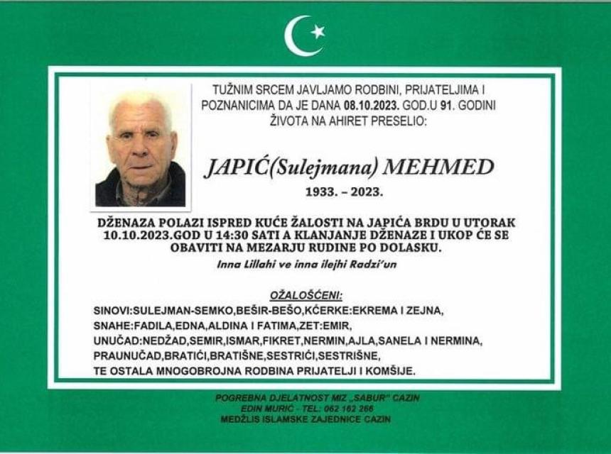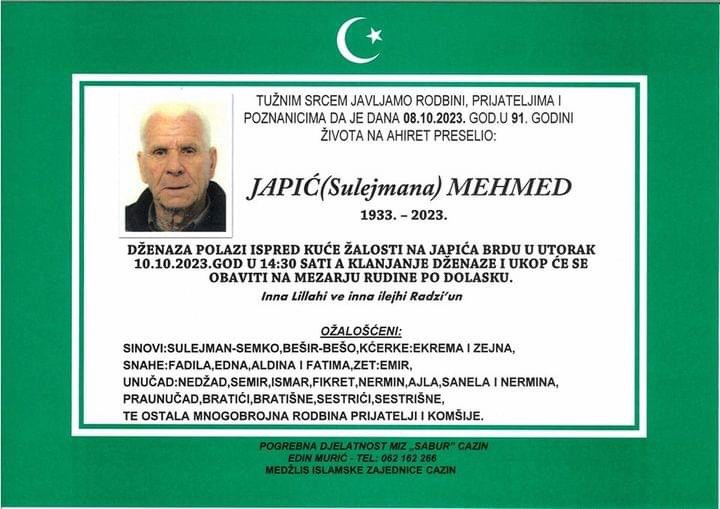 Tužnim srcem javljamo rodbini, prijateljima i poznanicima žalosnu vijest da nam je naš dragi Japić (Sulejmana) Mehmed, dana 08.10.2023. godine, u 91-oj godini života, preselio na Ahiret.