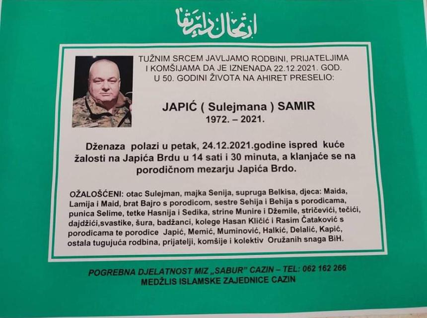 Tužnog srca i s bolom u duši obavještavamo rodbinu, komšije i prijatelje da je naš dragi Japić (Sulejmana) Samir dana 22.12.2021. u 50. godini života preselio na ahiret.