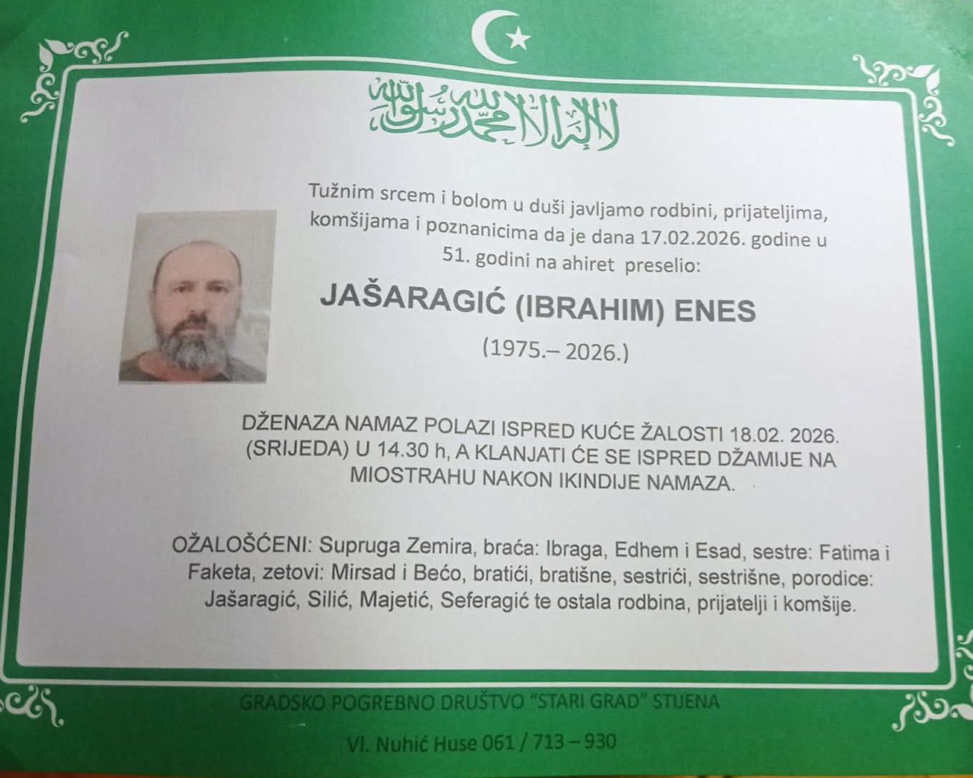 DŽENAZA NAMAZ POLAZI ISPRED KUĆE ŽALOSTI 18.02.2026. (SRIJEDA) U 14.30 h, A KLANJATI ĆE SE ISPRED DŽAMIJE NA MIOSTRAHU NAKON IKINDIJE NAMAZ.