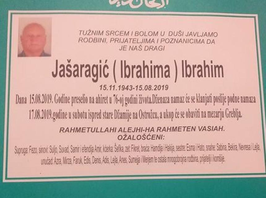 Tužnim srcem i bolom u duši javljamo rodbini, prijateljima i poznanicima da je naš dragi Jašaragić (Ibrahima) Ibrahim dana 15.08.2019. preselio na Ahiret u 76-oj godini života. Dženaza namaz će se klanjati poslije podne namaza 17.08.2019. u subotu ispred stare Džamije na Ostrošcu, a ukop će se obaviti na mezarju Greblja.