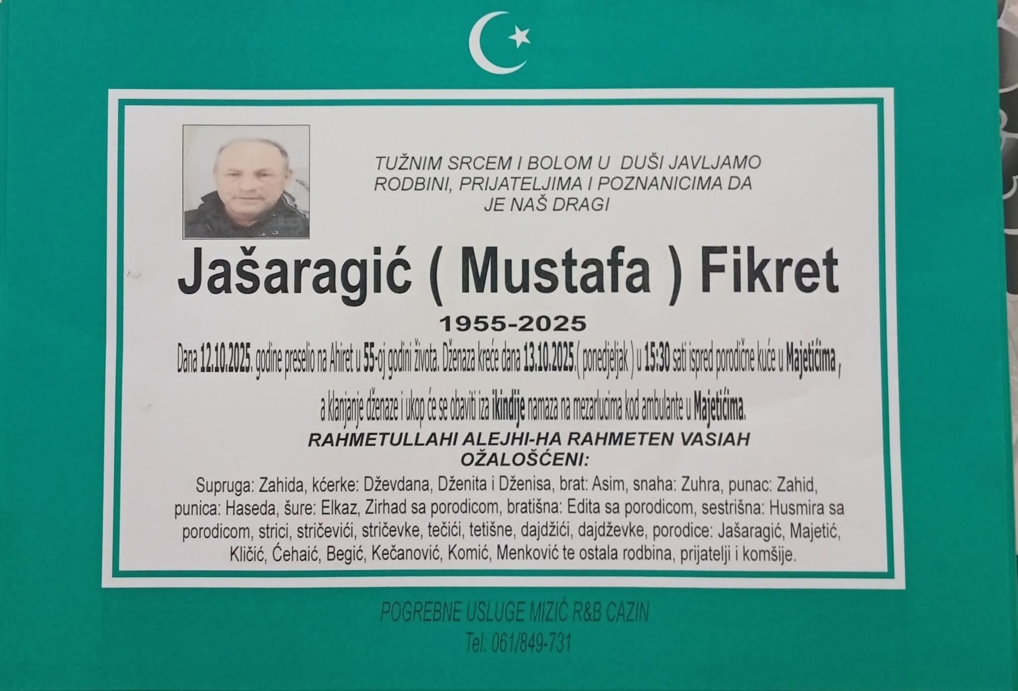 Dženaza kreće dana 13.10.2025. (ponedjeljak) u 15:30 sati ispred porodične kuće u Majetićima, a klanjanje dženaze i ukop će se obaviti iza ikindije namaza na mezarlucima kod ambulante u Majetićima.