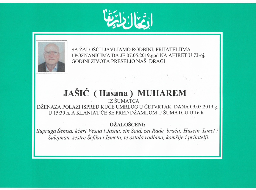 Sa žalošću javljamo rodbini, prijateljima i poznanicima da je 07.05.2019. godine na Ahiret u 73- oj. godini života preselila naš dragi Jašić (Hasana) Muharem iz Šumatca.