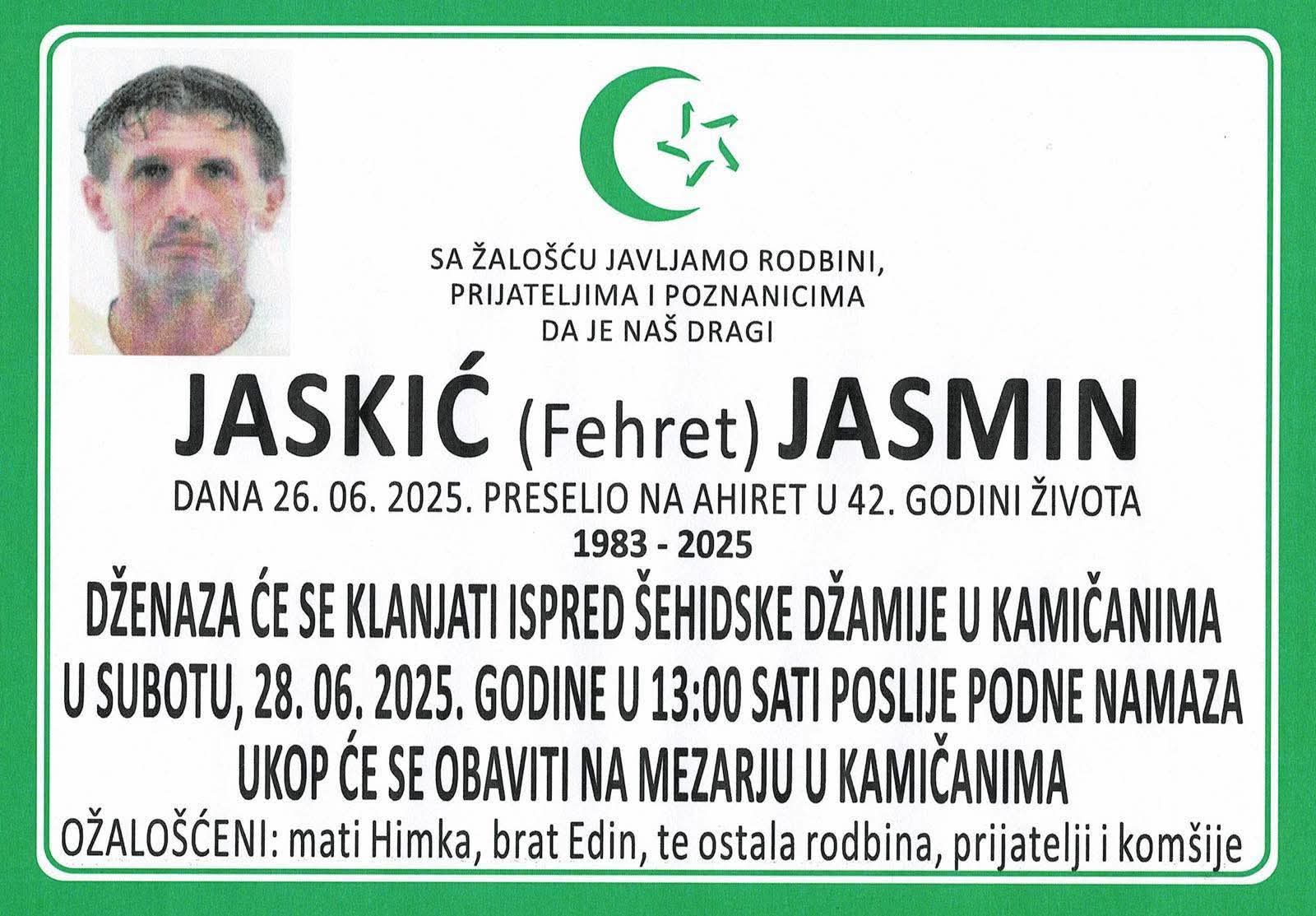 Dženaza će se klanjati ispred Šehidske džamije u Kamičanima u subotu 28.6.2025. godineu 13:00 sati poslije podne namaza.