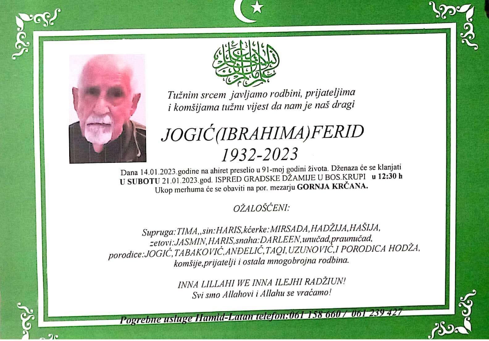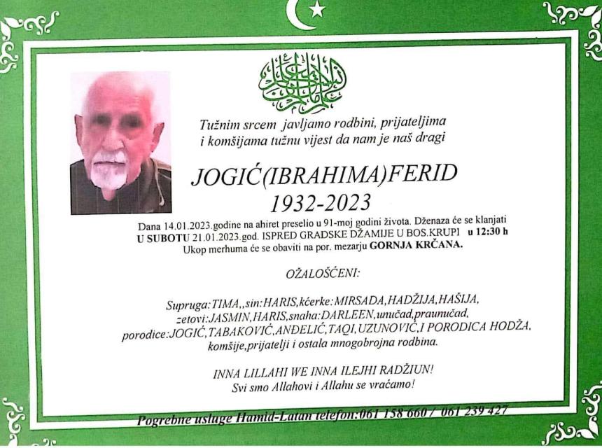 Tužnog srca i s bolom u duši obavještavamo rodbinu, komšije i prijatelje da je naš dragi Jogić (Ibrahima) Ferid u 91-oj godini života, preselio na Ahiret.