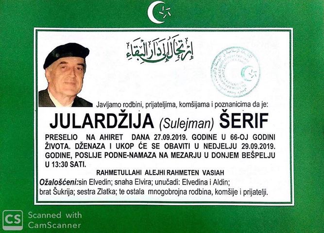 Javljamo rodbini, prijateljima, komšijama i poznanicima da je Julardžija (Sulejmana) Šerif preselio na Ahiret dana 27.09.2019. godine u 66-oj godini života.