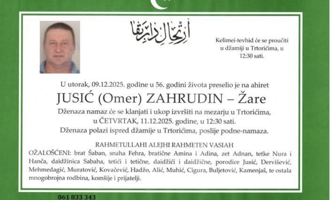 Dženaza namaz će se klanjati i ukop izvršiti na mezarju u Trtorićima, u ČETVRTAK, 11.12.2025. godine, u 12:30 sati.