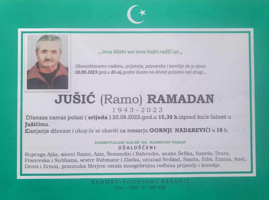 Tužnim srcem i bolom u duši javljamo rodbini i prijateljima da je naš dragi Jušić (Ramo) Ramadan dana 18.09.2023.god. u 81-oj god. preselio na Ahiret