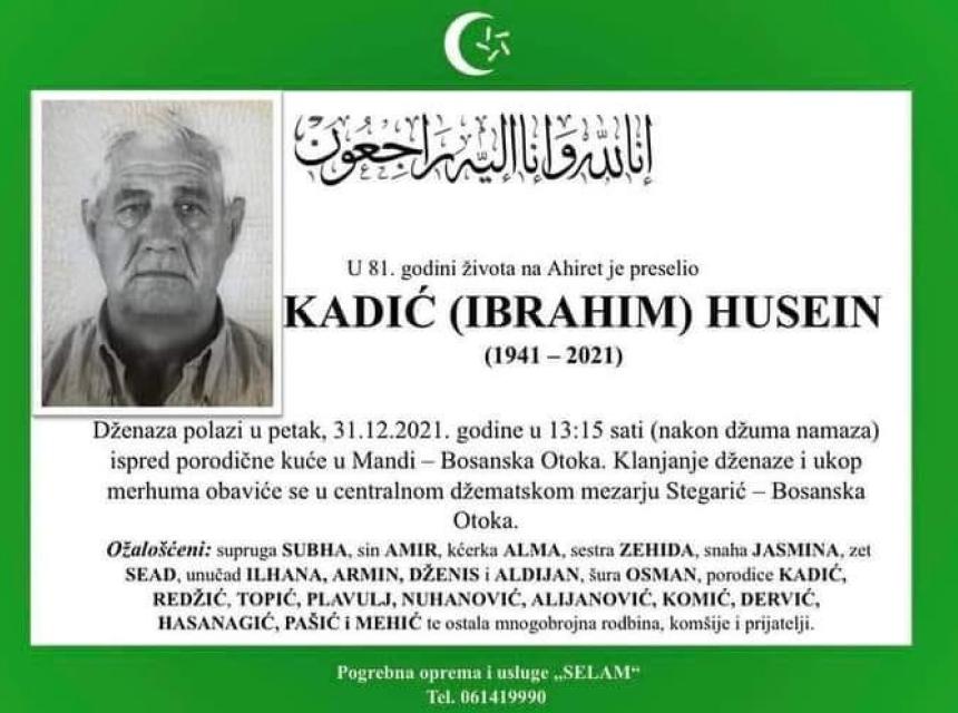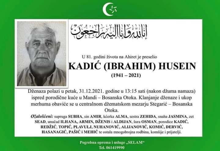 Tužnog srca i s bolom u duši obavještavamo rodbinu, komšije i prijatelje da je naš dragi Kadić (Ibrahim) Husein, u 81-oj godini živoa, preselio na Ahiret.