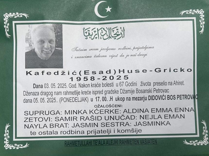Dana 03.05.2025.God. Nakon kraće bolesti u 67 Godini života preselio na Ahiret. Dženaza milog nam rahmetlije kreće ispred gradske Džamije Bosanski Petrovac dana 05.05.2025. (PONEDELJAK) u 17:00 h. Ukop na mezarju DIDOVIĆI BOS PETROVAC.