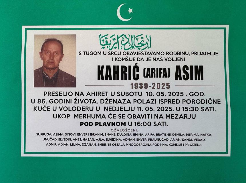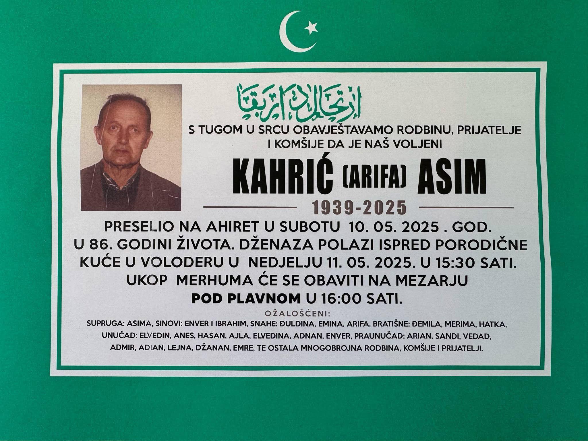 Tužnim srcem i bolom u duši javljamo rodbini, prijateljima i komšijama da je naš dragi Kahrić (Arifa) Asim, dana 10.05.2025. godine u 86-oj godini života, preselio na Ahiret.