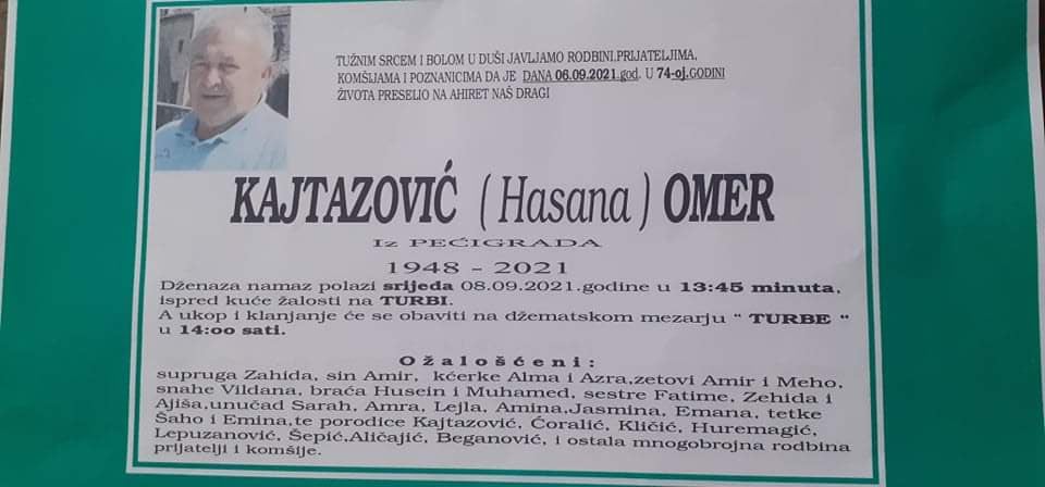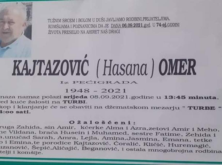 Tužnog srca i s bolom u duši obavještavamo rodbinu, komšije i prijatelje da je naš dragi Kajtazović (Hasana) Omer, dana 06.09.2021 godine, u 74-oj godini života, preselio na Ahiret.