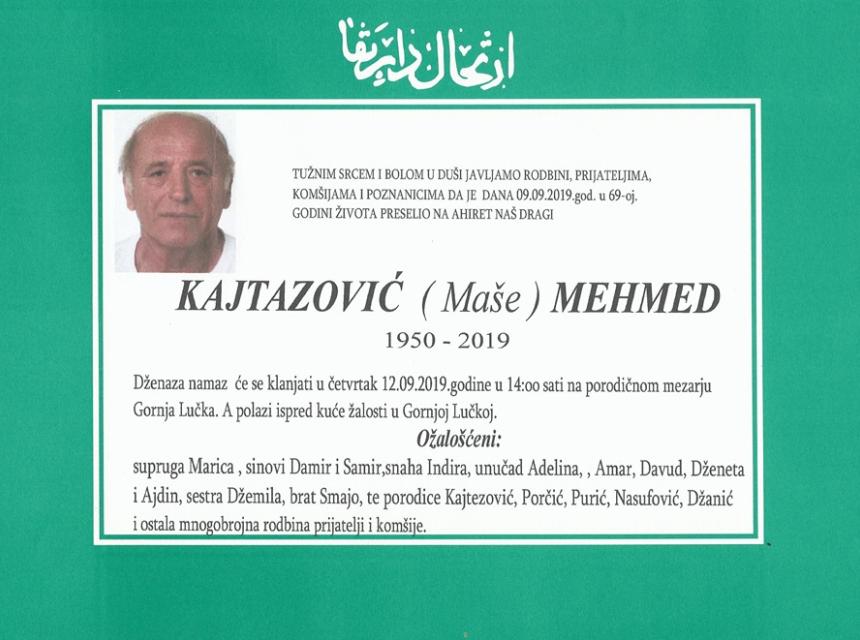 Tužnim srcem i bolom u duši javljamo rodbini, prijateljima, komšijama i poznanicima da je 09.09.2019.god. u 69-oj. godini života preselio na Ahiret naš dragi Kajtazović (Maše) Mehmed.