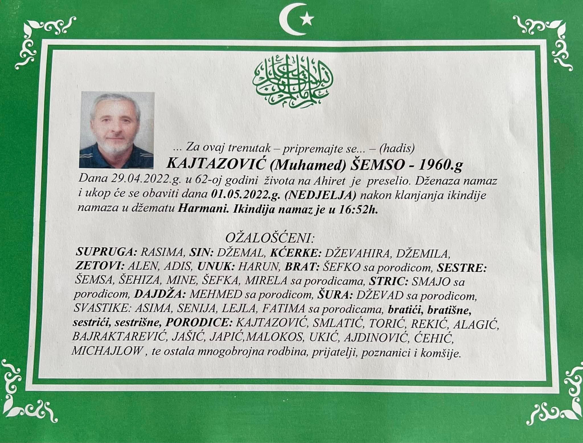 Tužnog srca i s bolom u duši obavještavamo rodbinu, komšije i prijatelje da je naš dragiKajtazović (Muhamed) Šemso, dana 29.04.2022. godine, u 62-oj godini života, preselio na Ahiret.
