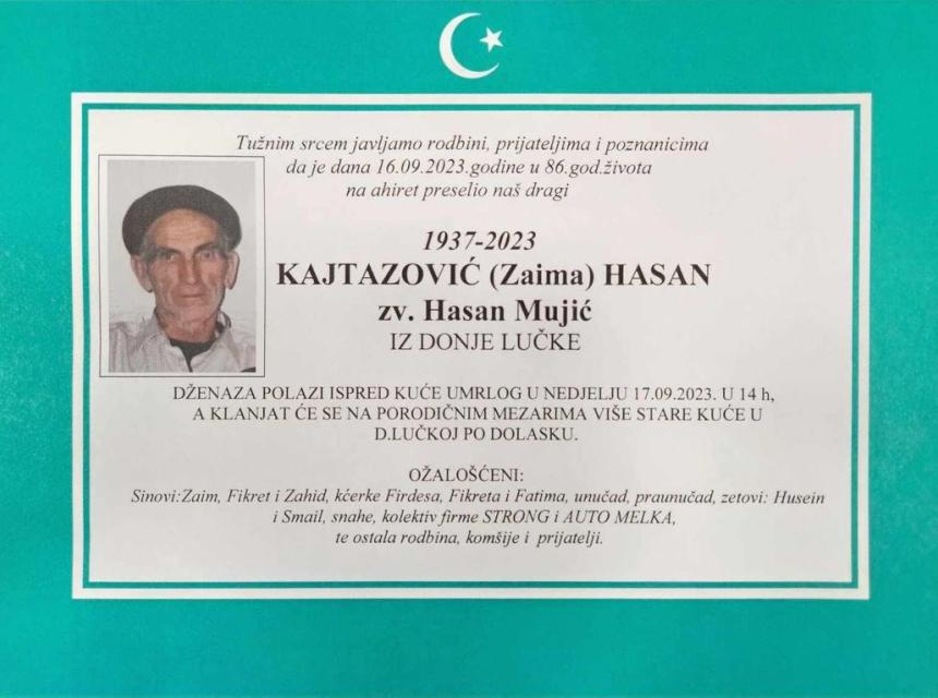 Tužnim srcem i bolom u duši javljamo rodbini i prijateljima da je naš dragi Kajtazović (Zaima) Hasan dana 16.09.2023.god. u 86-oj god. preselio na Ahiret