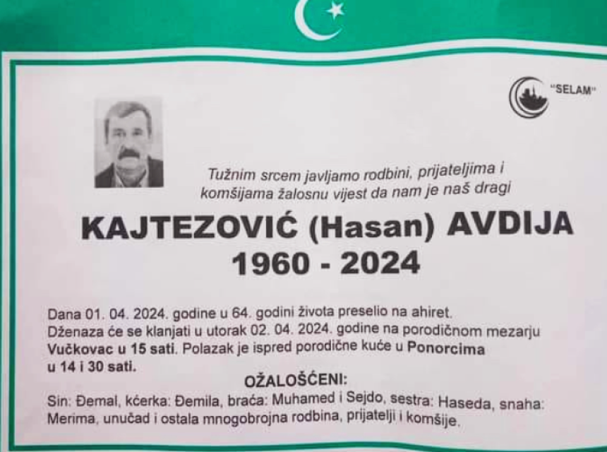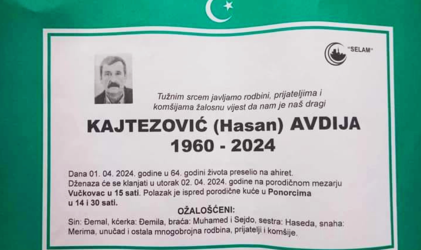 Tužnim srcem javljamo rodbini, prijateljima i komšijama žalosnu vijest da nam je naš dragi KAJTEZOVIĆ (Hasan) AVDIJA dana 01. 04. 2024. godine u 64. godini života preselio na Ahiret.