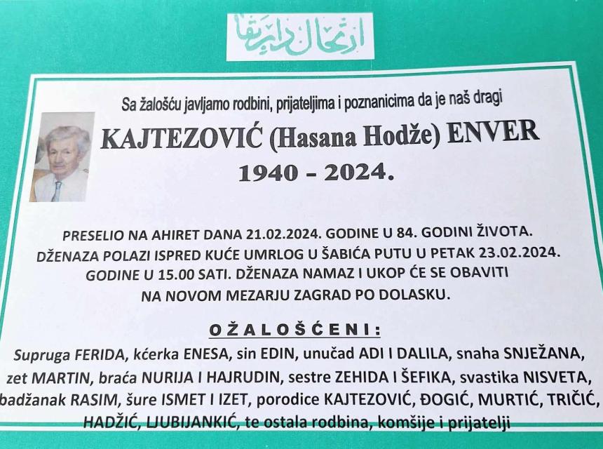 Obavještavamo rodbinu i prijatelje da je 21. februara na Ahiret u 84. godini života preselio Kajtezović (Hasana hodže) Enver.