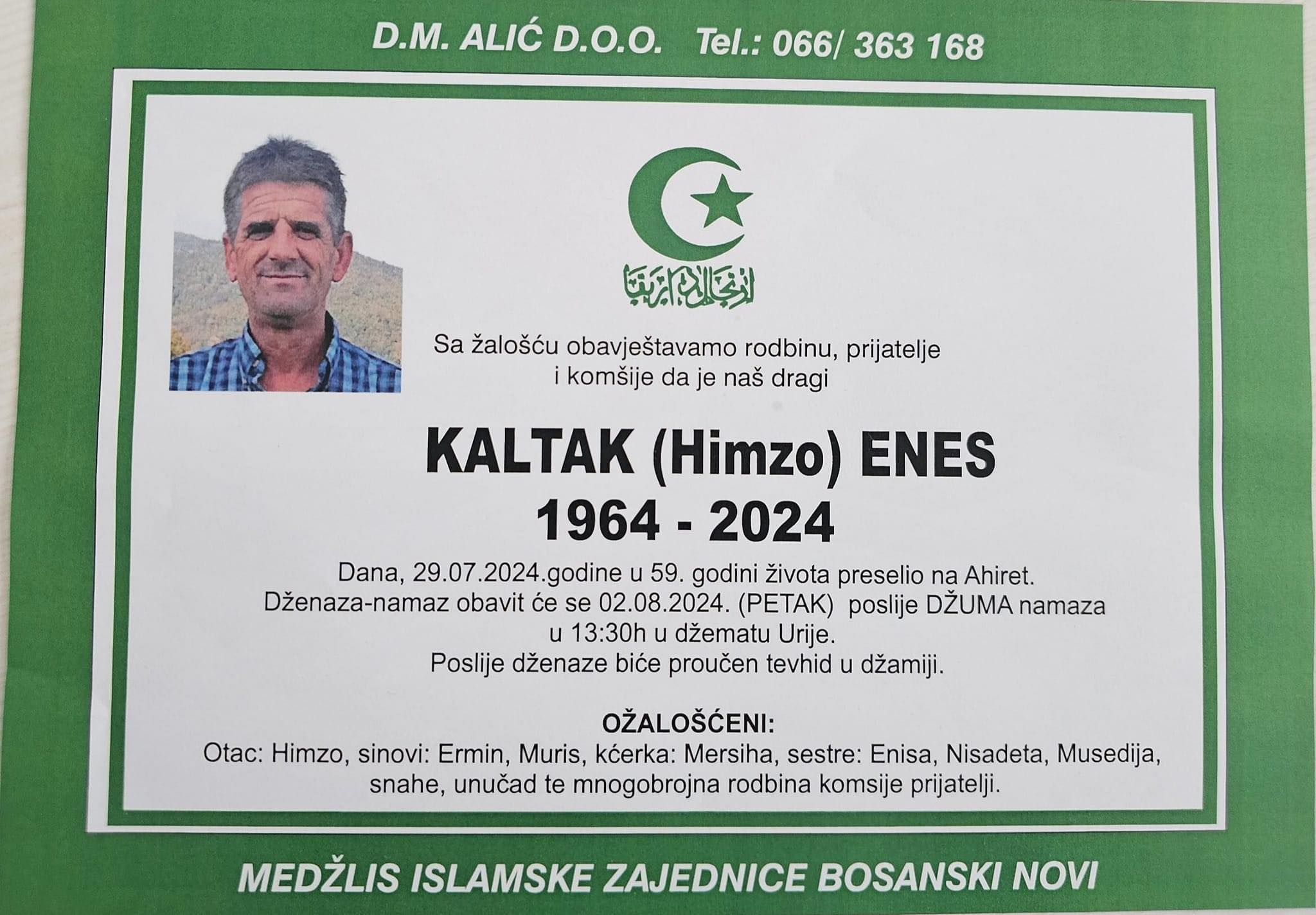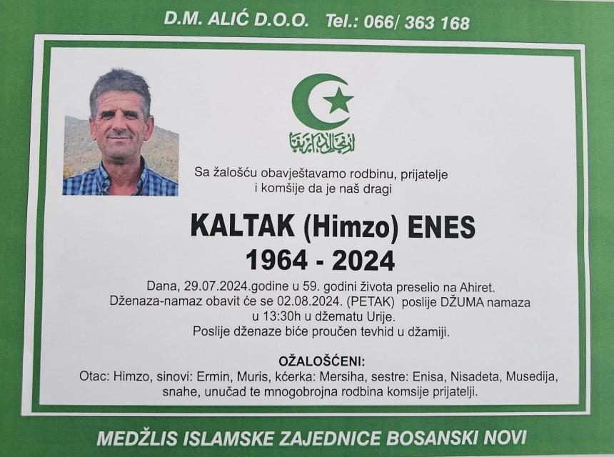 Sa žalošću obavještavamo rodbinu, prijateje i komšije da je naš dragi KALTAK (Himzo) ENES dana 29.07.2024. godine u 59-oj godini života preselio na ahiret.