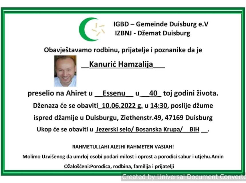 Tužnog srca i s bolom u duši obavještavamo rodbinu, komšije i prijatelje da je naš dragi Kanurić Hamzalija u 40. godini života u Essenu preselio na Ahiret.
