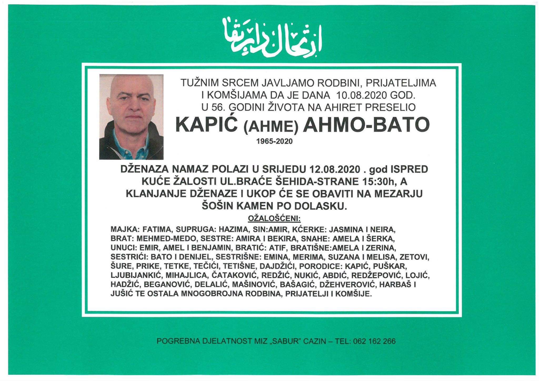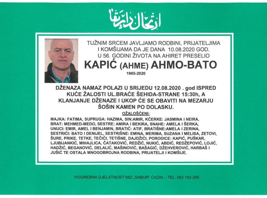 Tužnog srca i s bolom u duši obavještavamo rodbinu, komšije i prijatelje da je naš dragi Kapić (Ahme) Ahmo-Bato dana 10.08.2020. godine, u 56-oj. godini života, preselio na Ahiret.