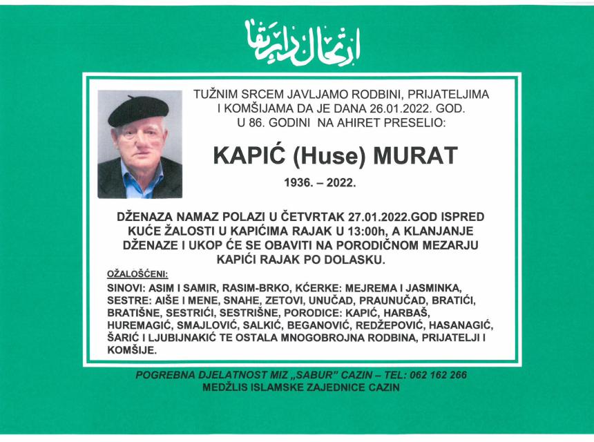 Tužnog srca i s bolom u duši obavještavamo rodbinu, komšije i prijatelje da je naš dragi Kapić (Huse) Murat, dana 26.01.2022. godine, u 86-oj godini života, preselio na Ahiret.