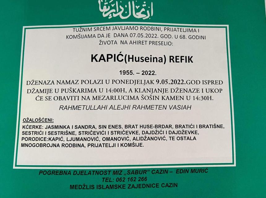 Tužnog srca i s bolom u duši obavještavamo rodbinu, komšije i prijatelje da je naš dragi Kapić (Huseina) Refik u 68. godini života preselio na Ahiret.