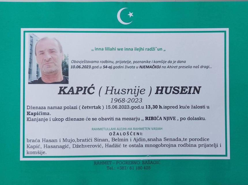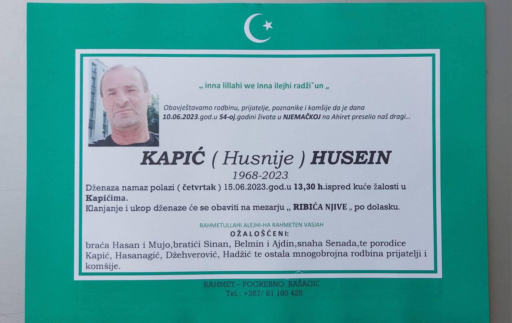 Tuznim srcem javljamo rodbini, prijateljima i komsijama tuznu vijest da nam je nas dragi Kapić ( Husnije) Husejin, dana , 10.06.2023.godine na Ahiret preselio u 54-oj godini.