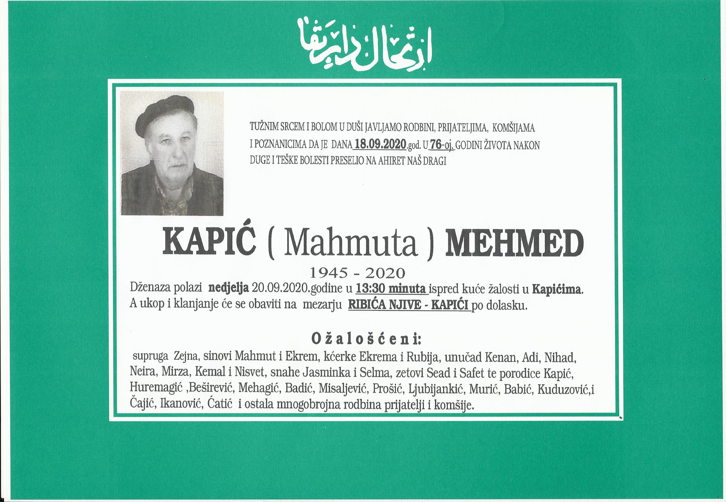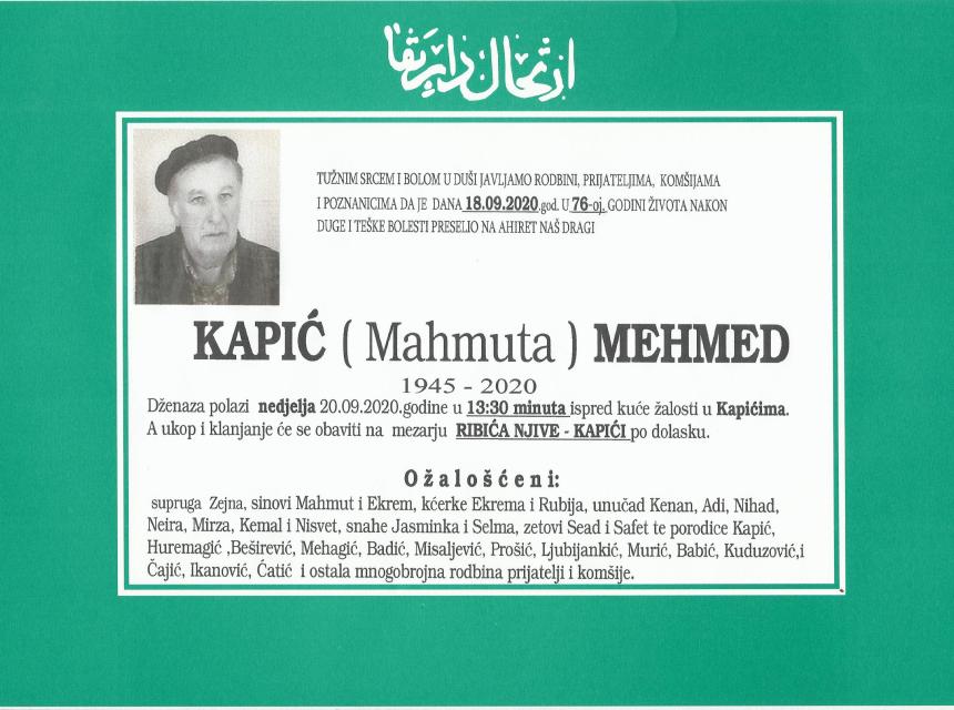 Tužnog srca i s bolom u duši obavještavamo rodbinu, komšije i prijatelje da je naš dragi Kapić (Mahmuta) Mehmed, dana 18.09.2020. godine, u 76-oj. godini života, preselio na Ahiret.