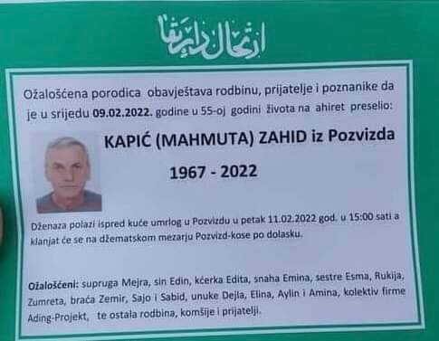 Tužnog srca i s bolom u duši obavještavamo rodbinu, komšije i prijatelje da je naš dragi Kapić (Mahmuta) Zahid iz Podzvizda 09.02.2022. u 55. godini života preselio na ahiret.