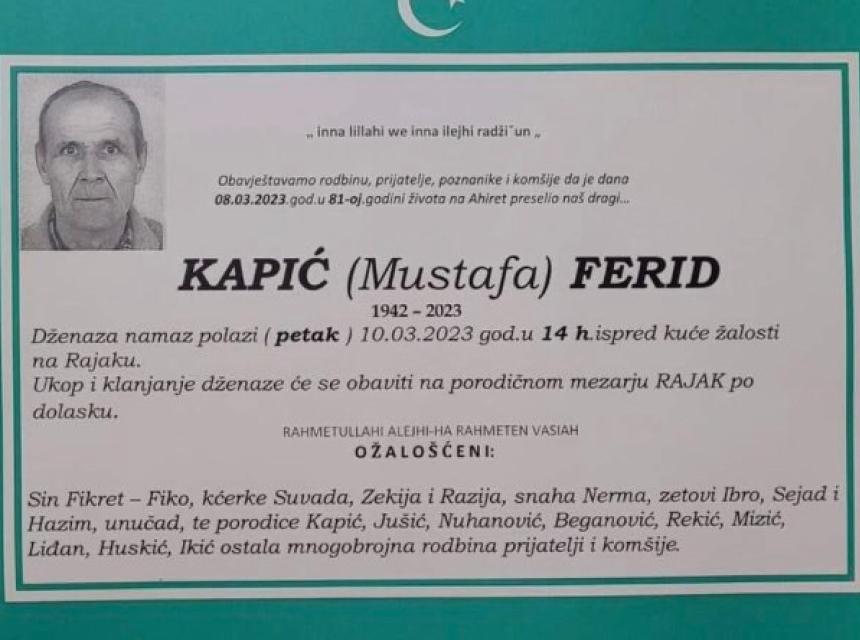 Tužnim srcem i s bolom u duši javljamo rodbini, prijateljima i komšijama da je naš dragi Kapić (Mustafa) Ferid, dana 08.03.2023. godine u 81-oj godini života, preselio na Ahiret.