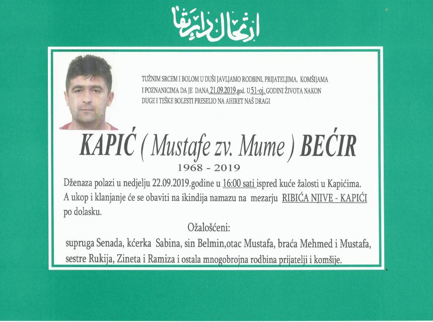 Sa žalošću javljamo rodbini, prijateljima i poznanicima da je naš dragi Kapić (Mustafe zv. Mume) Bećir dana 21.09.2019. godine, preselio na Ahiret u 51-oj godini života.