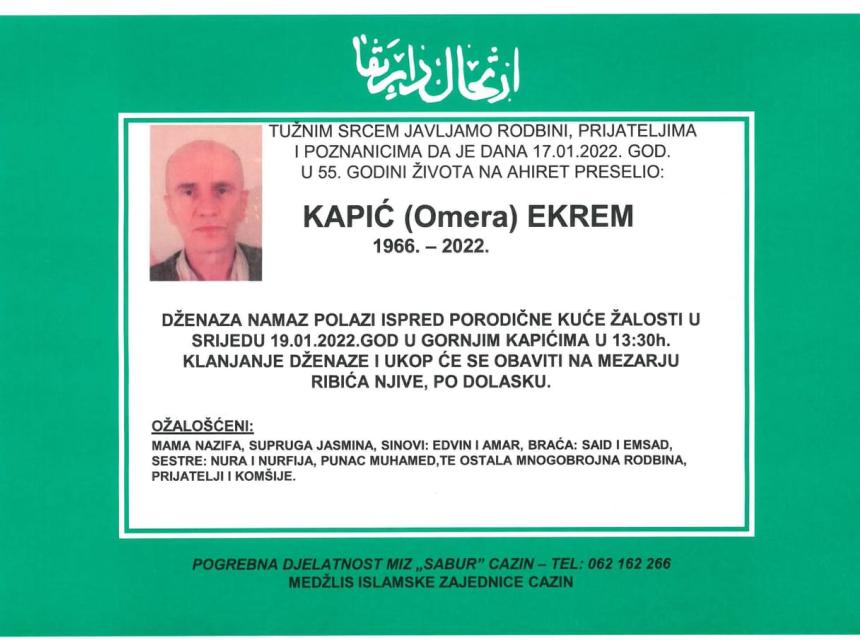 Tužnog srca i s bolom u duši obavještavamo rodbinu, komšije i prijatelje da je naš dragi Kapić (Omera) Ekrem, dana 17.01.2022. godine, u 55-oj godini života, preselio na Ahiret.