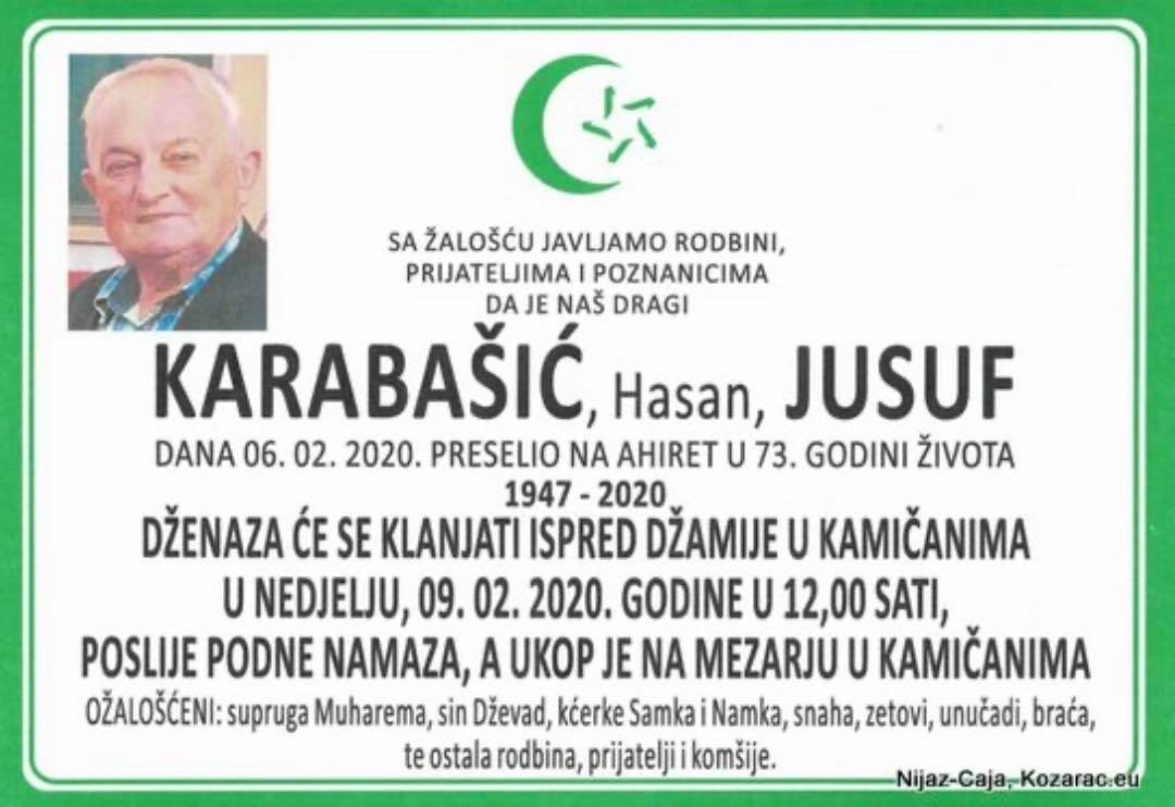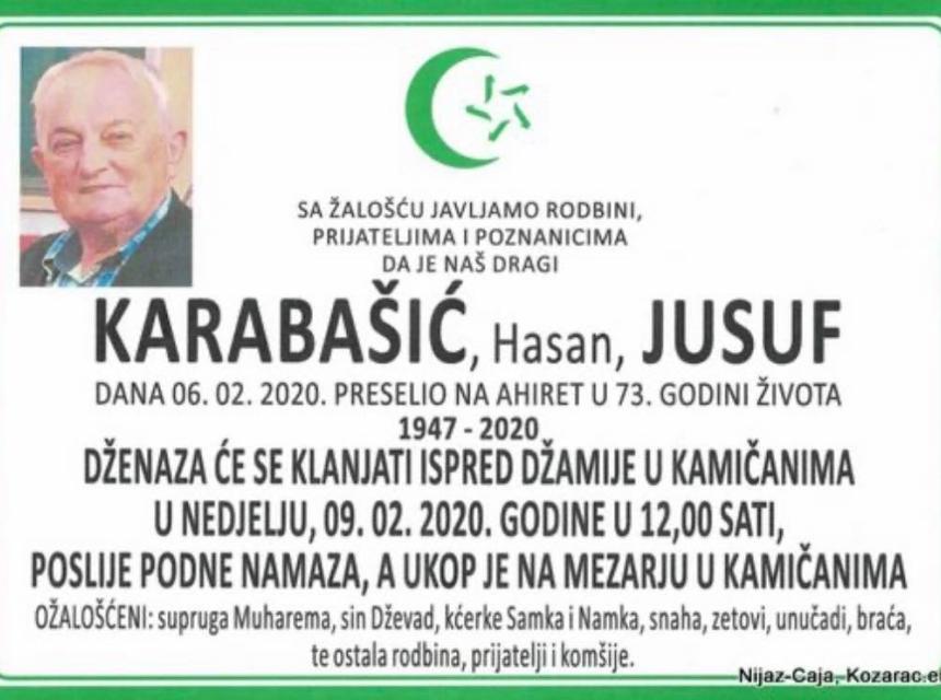 Tužnim srcem i bolom u duši javljamo rodbini, prijateljima i komšijama da je dana 06.02.2020. godine u 73. godini života na Ahiret preselio Karabašić (Hasan) Jusuf.