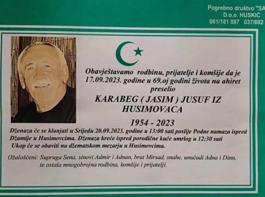 Obavještavamo rodbinu, prijatelje i komšije da je 17.09.2023. godine u 69.oj godini života na Ahiret preselio KARABEG (JASIM) JUSUF IZ HUSIMOVACA.