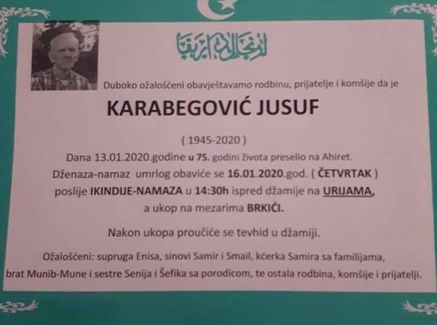 Tužnim srcem i bolom u duši javljamo rodbini i prijateljima da je dana 13.01.2020. godine u 75. godini života na Ahiret preselio Karabegović Jusuf.