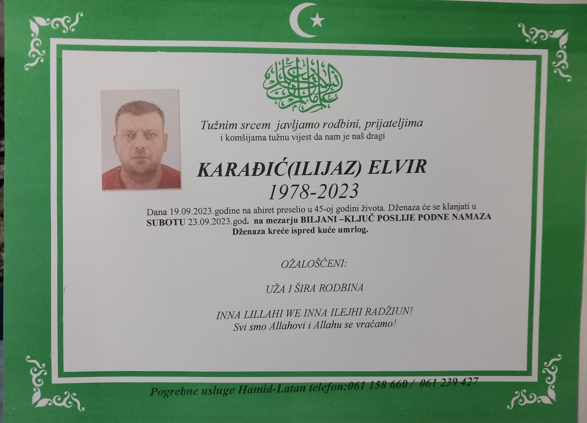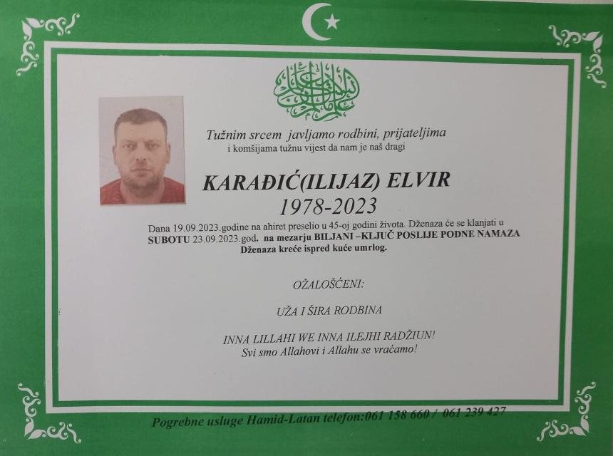 Obavještavamo rodbinu, prijatelje i komšije da je naš dragi Karađić (Ilijaz) Elvir dana 19.09.2023.godine u 45-oj godini života preselio na Ahiret.