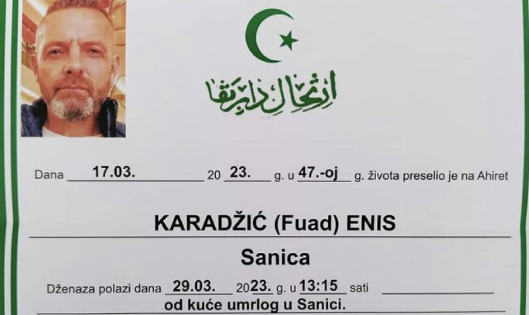 Tužnim srcem javljamo rodbini, prijateljima i poznanicima da je naš dragi Karadžić (Fuad) Enis dana 17.03.2023. godine u 47-oj godini života na Ahiret preselio.