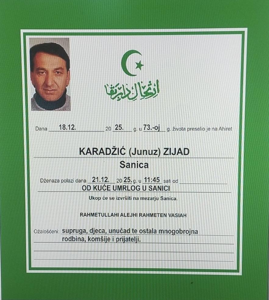 Dženaza polazi dana 21.12.2025. u 11:45 sati OD KUĆE UMRLOG U SANICI.