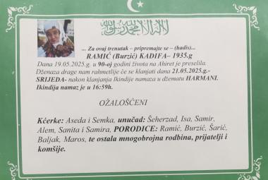 Dženaza kreće ispred porodične kuće umrlog u Trnovima u ponedeljak 24.06.2024. godine u 14:00 sati a klanjat će se pred džamijom u Trnovima po dolasku.