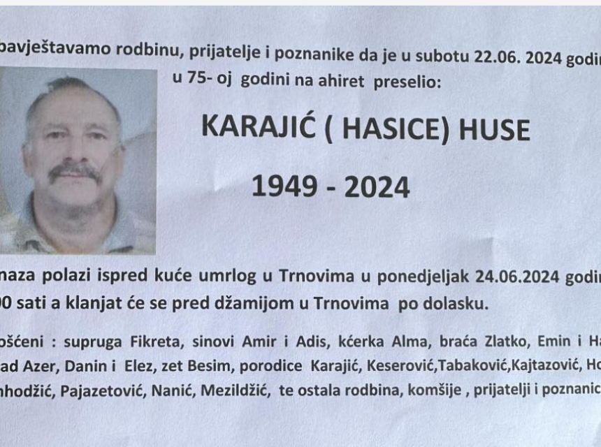 Tužnim srcem i bolom u duši javljamo rodbini, prijateljima i komšijama da je naš dragi Karajić (Hasice) Huse, dana 22.06.2024. godine u 75-oj godini života, preselio na Ahiret.